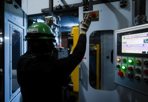 ここでは砂型を製作します。金型を使って砂を押し固めて砂型をつくります。造型機には縦型と横型があり、さまざまな形状の製品にも対応できます。
