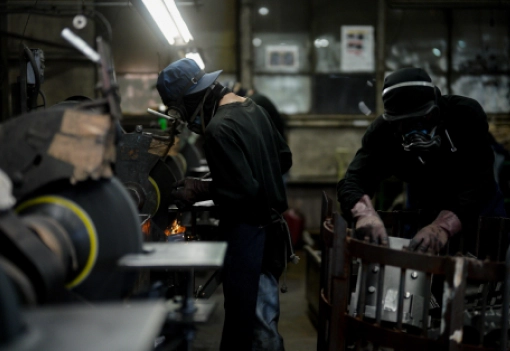 ここでは製品に残ったバリや不要な部分を切削して磨きます。火花や粉末が飛ぶので、しっかり防護した上で作業を行います。