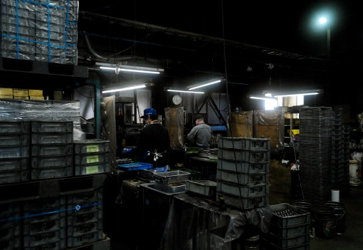 完成した製品を検品するエリアです。担当スタッフは女性が多いです。量がある中で、迅速かつ確実な検品作業が求められます。